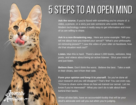 “Well we did it this way at our facility.” “You should feed after every bridge, it’s the best way to do it.” “Variable reinforcement leads to better behavior.” “Oh them, their animals aren’t even station trained.” “Did you see they were walking a cheetah on a pinch collar.” “Did you hear they were using a bird to take donations from a guest.” “We don’t have jesses on any of our raptors, they have choice.”
